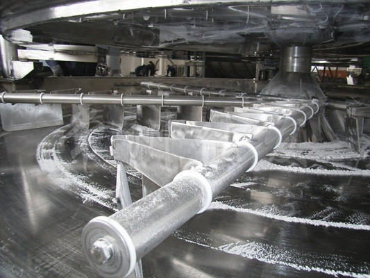 濕物料自加料器連續(xù)地加到干燥器上部第一層干燥盤上,帶有耙葉的耙臂做回轉(zhuǎn)運動使耙葉連續(xù)地翻抄物料。物料沿指數(shù)螺旋線流過干燥盤表面,在小干燥盤上的物料被移送到外緣,并在外緣落到下方的大干燥盤外緣,在大干燥盤上物料向里移動并從中間落料口落入下一層小干燥盤中。大小干燥盤上下交替排列,物料得以連續(xù)地流過整個干燥器。中間的干燥盤內(nèi)通入加熱介質(zhì),加熱介質(zhì)形式有飽和蒸汽、熱水和導熱油,加熱介質(zhì)由干燥盤的一端進入,從另一端導出。已干物料從最后一層干燥盤落到殼體的底層,最后被耙葉移送到出料口排出。濕份從物料中溢出,由設在頂蓋上的排濕口排出,真空型盤式干燥器的濕氣由設在頂蓋上的真空泵口抽出。從底層排出的干物料可直接包裝。通過配備翅片加熱器、溶劑回收冷凝器、布袋除塵器、干料返混機構(gòu)、引風機等輔機,可提高其干燥的生產(chǎn)能力,干燥膏糊狀和熱敏性物料,可方便地回收溶劑,并能進行熱解和反應操作。
