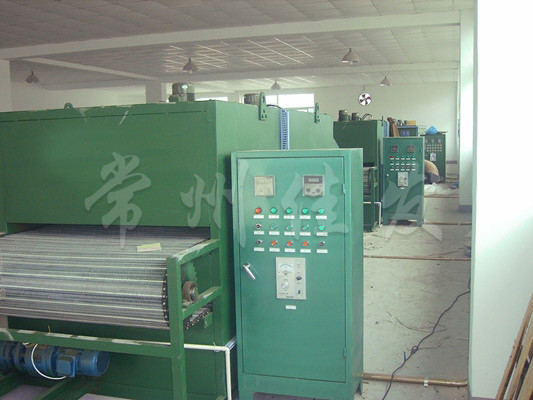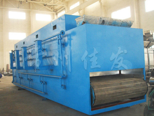 物料由加料器均勻地鋪在網(wǎng)帶上,網(wǎng)帶一般采用12-60目不銹鋼絲網(wǎng),由傳動(dòng)裝置拖動(dòng)在干燥機(jī)內(nèi)移動(dòng)。干燥機(jī)由若干單元組成,每一單元熱風(fēng)獨(dú)立循環(huán),部分尾氣由專門濕風(fēng)機(jī)排出,廢氣由調(diào)節(jié)閥控制,熱氣由下往上或由上往下穿過(guò)鋪滿物料的網(wǎng)帶完成熱量與質(zhì)量傳遞的進(jìn)程,帶走物料的水份。網(wǎng)帶緩慢移動(dòng),運(yùn)行速度可根據(jù)物料溫度自動(dòng)調(diào)節(jié),干燥后的成品連續(xù)落入收料器中。上下循環(huán)單元根據(jù)用戶需要可靈活配備,單元數(shù)量亦可根據(jù)需要選取。